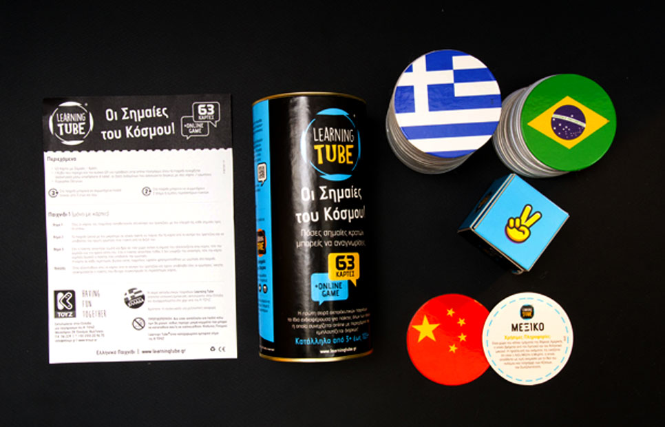- 63 cards with flags- countries- 1 cube that contains the QR code for access to the online platform where the game continues on Internet through smartphone and tablet, using a data base that is renewed constantly with the new cards/questions.